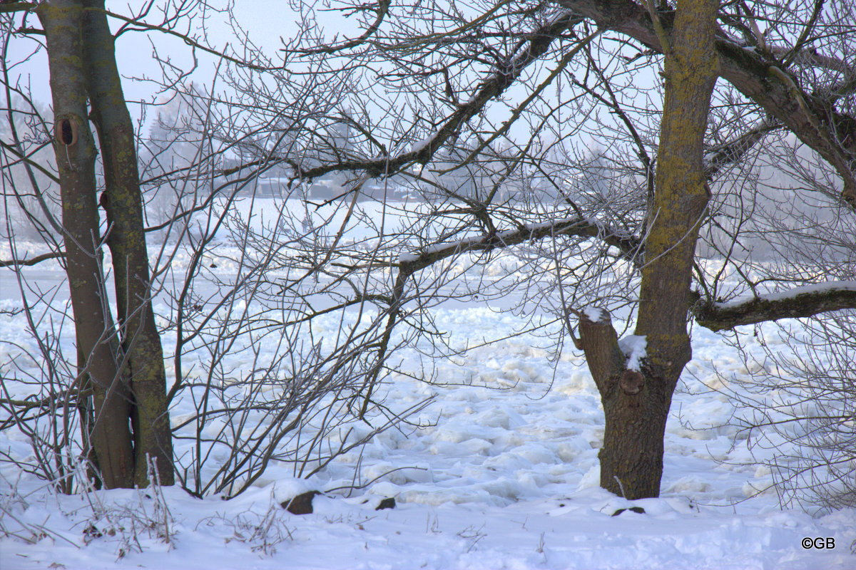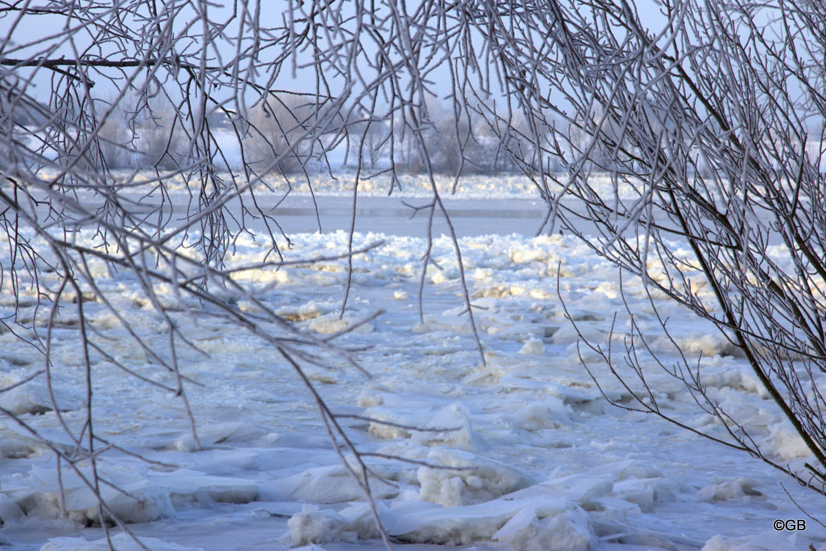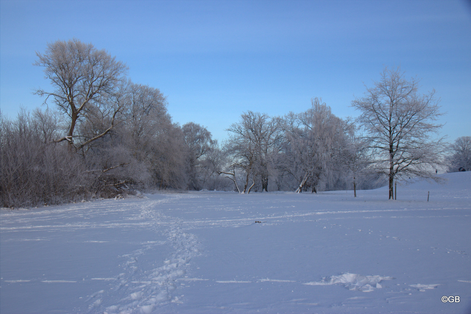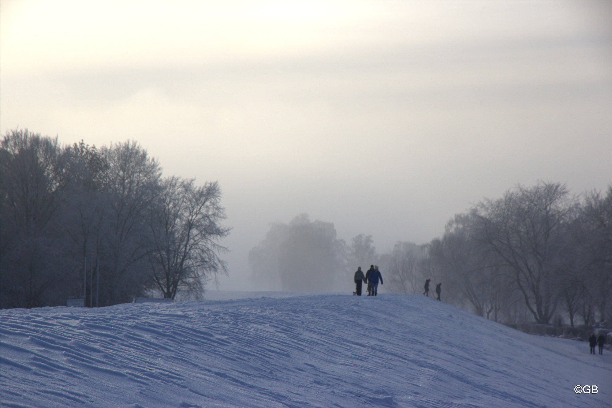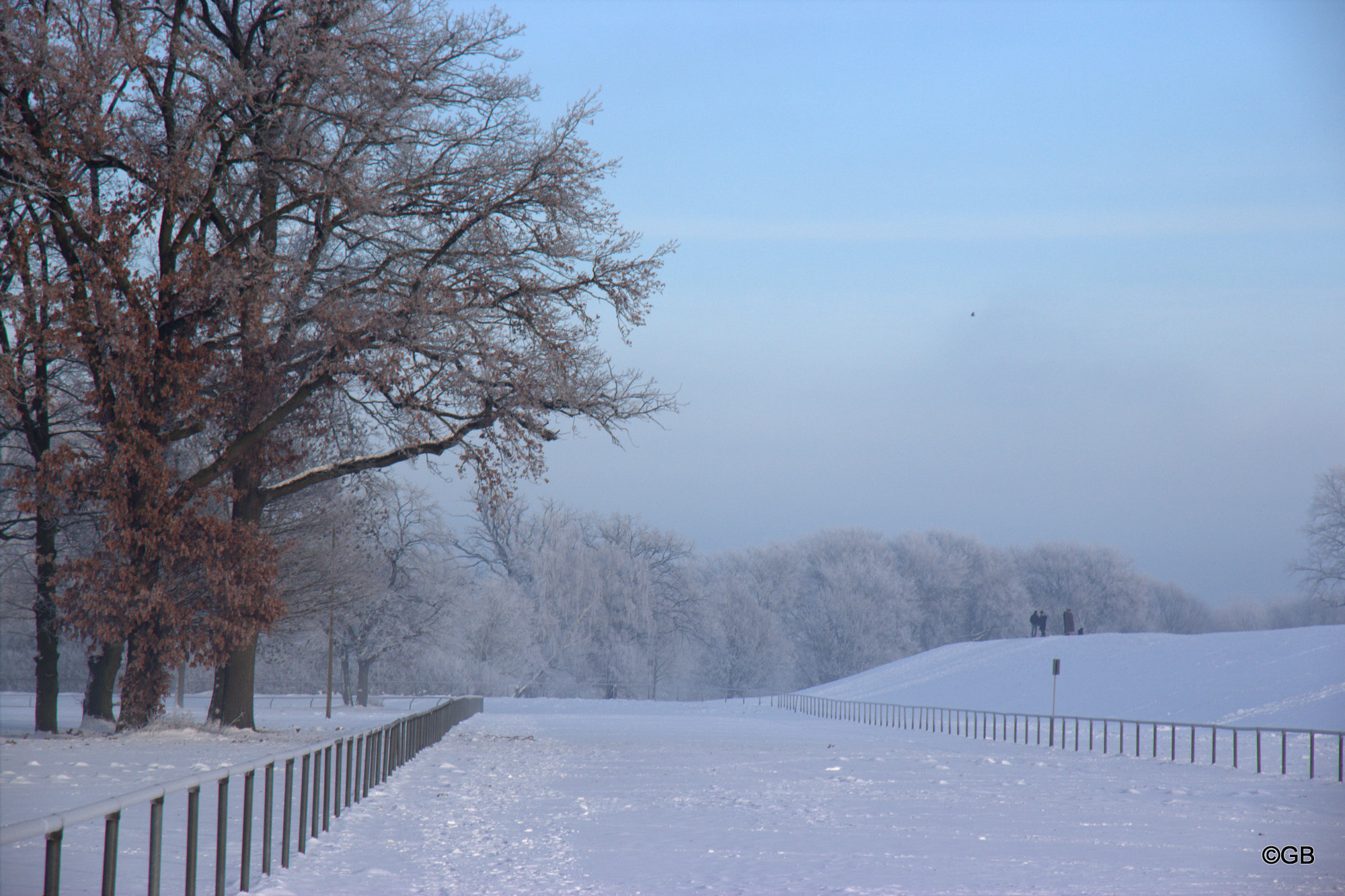 Höchst beeindruckend präsentierte sich die Landschaft in Schnee und Eis. Der Deich wurde von Spaziergängern zum Wandern genutzt, aber auch als ideale Rodelbahn. Die kalte Wintersonne tauchte alles in ein wunderschönes, teils sogar mystisches Licht, da auch Nebelschwaden übers Land zogen. – Wir stapften durch hohen Schnee auf der Rennbahn und unsere Vierbeiner wälzten sich genüsslich in der weißen Pracht. Am Elbstrand bewunderten wir die großen Eisschollen, aber betraten diesen Bereich vorsichtshalber nicht – sogar Sanny und Bonny blieben in unserer Nähe und wagten sich nicht an den Strand. Sie gingen meist sehr brav neben uns her, bis wir merkten, dass sie natürlich durch die vielen Eisklumpen an ihren Pfoten und Beinen beeinträchtigt waren. Nachdem wir sie davon befreit hatten, tollten Mutter und Tochter wieder vor lauter Freude miteinander im Schnee herum. – Wir beendeten unseren Rundgang bei Minus 6°C auf dem Deich und hatten dort noch nette Begegnungen mit Menschen, die unsere Begeisterung für das ungewöhnliche "Wintermärchen Stove" teilten.