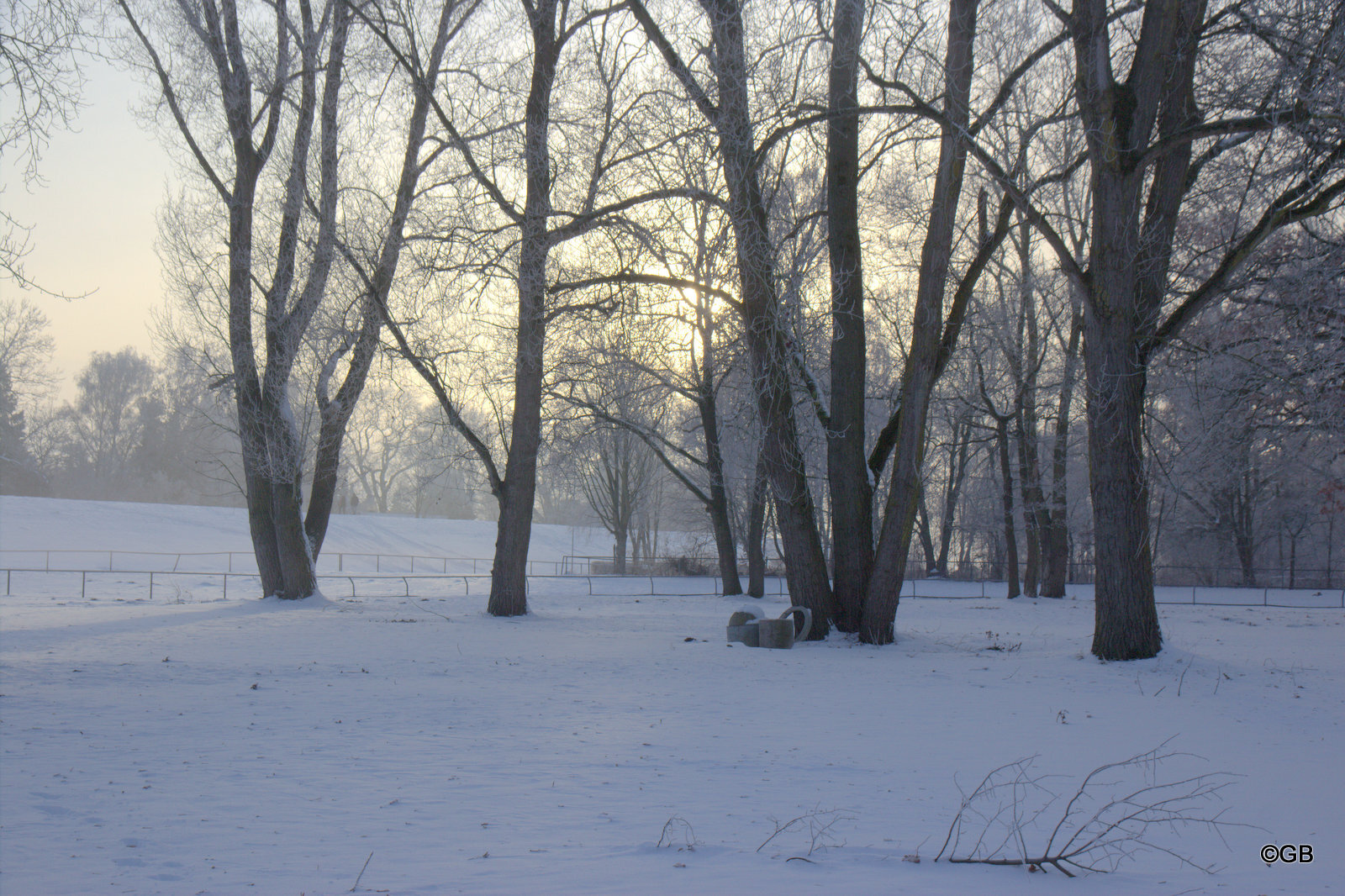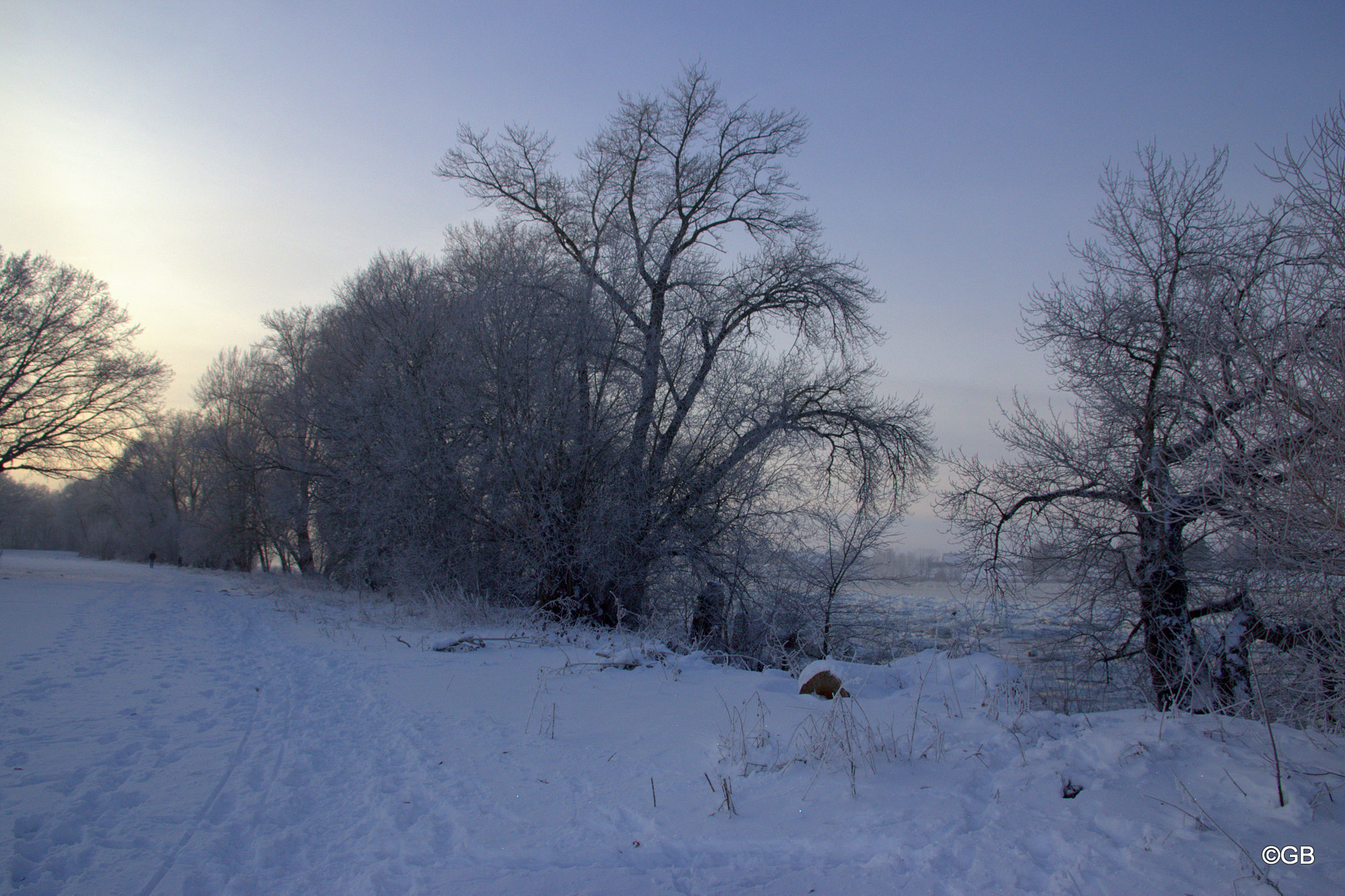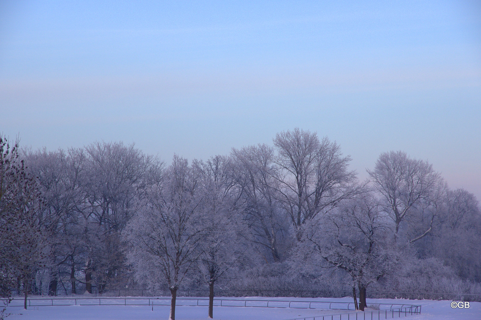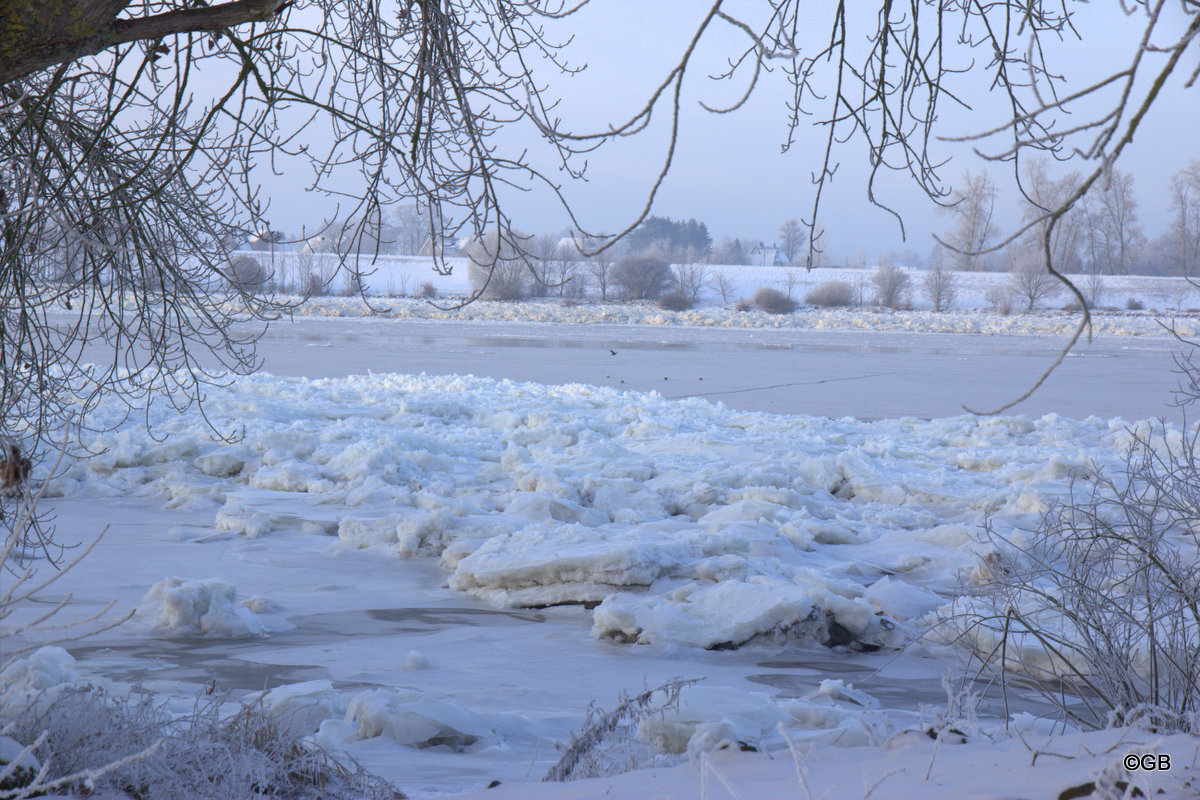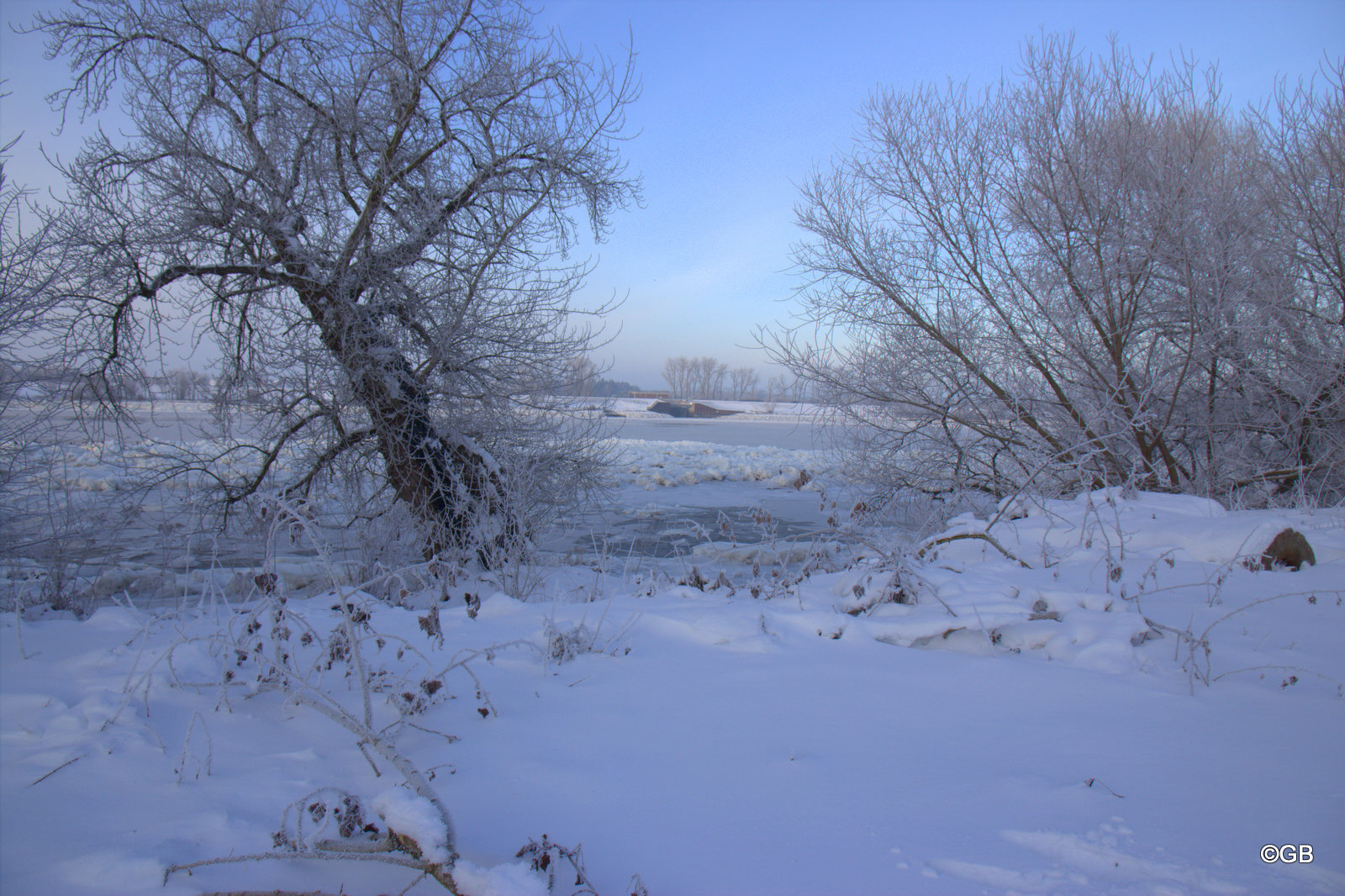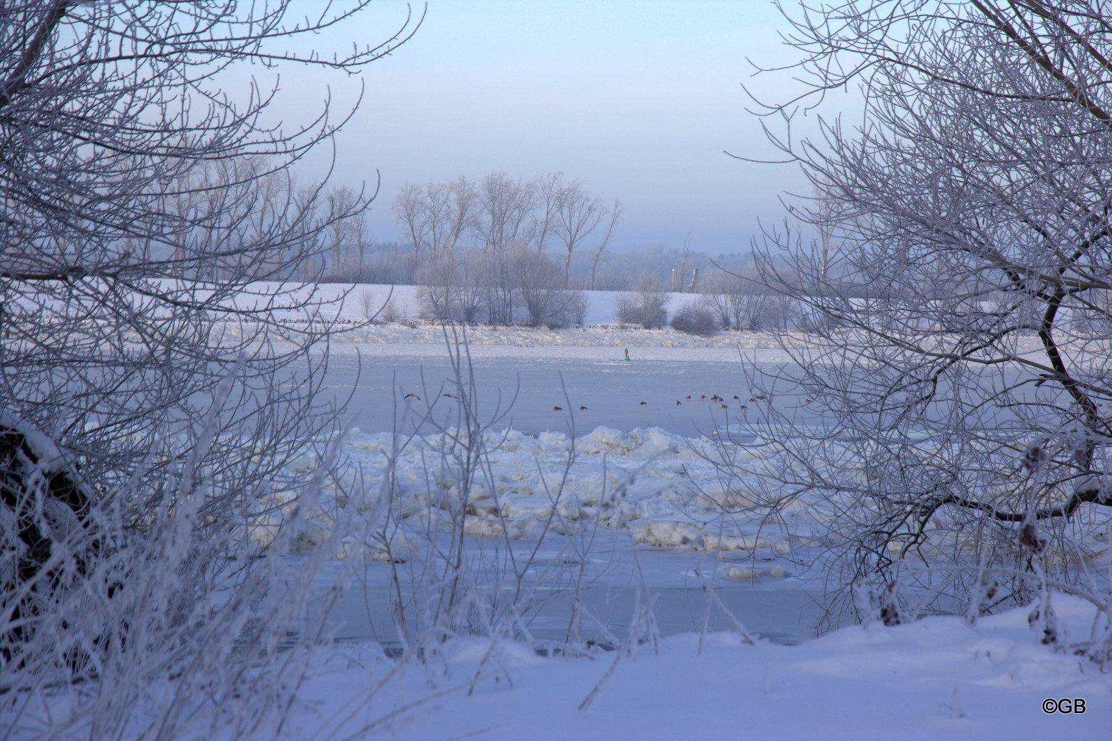 Höchst beeindruckend präsentierte sich die Landschaft in Schnee und Eis. Der Deich wurde von Spaziergängern zum Wandern genutzt, aber auch als ideale Rodelbahn. Die kalte Wintersonne tauchte alles in ein wunderschönes, teils sogar mystisches Licht, da auch Nebelschwaden übers Land zogen. – Wir stapften durch hohen Schnee auf der Rennbahn und unsere Vierbeiner wälzten sich genüsslich in der weißen Pracht. Am Elbstrand bewunderten wir die großen Eisschollen, aber betraten diesen Bereich vorsichtshalber nicht – sogar Sanny und Bonny blieben in unserer Nähe und wagten sich nicht an den Strand. Sie gingen meist sehr brav neben uns her, bis wir merkten, dass sie natürlich durch die vielen Eisklumpen an ihren Pfoten und Beinen beeinträchtigt waren. Nachdem wir sie davon befreit hatten, tollten Mutter und Tochter wieder vor lauter Freude miteinander im Schnee herum. – Wir beendeten unseren Rundgang bei Minus 6°C auf dem Deich und hatten dort noch nette Begegnungen mit Menschen, die unsere Begeisterung für das ungewöhnliche "Wintermärchen Stove" teilten.