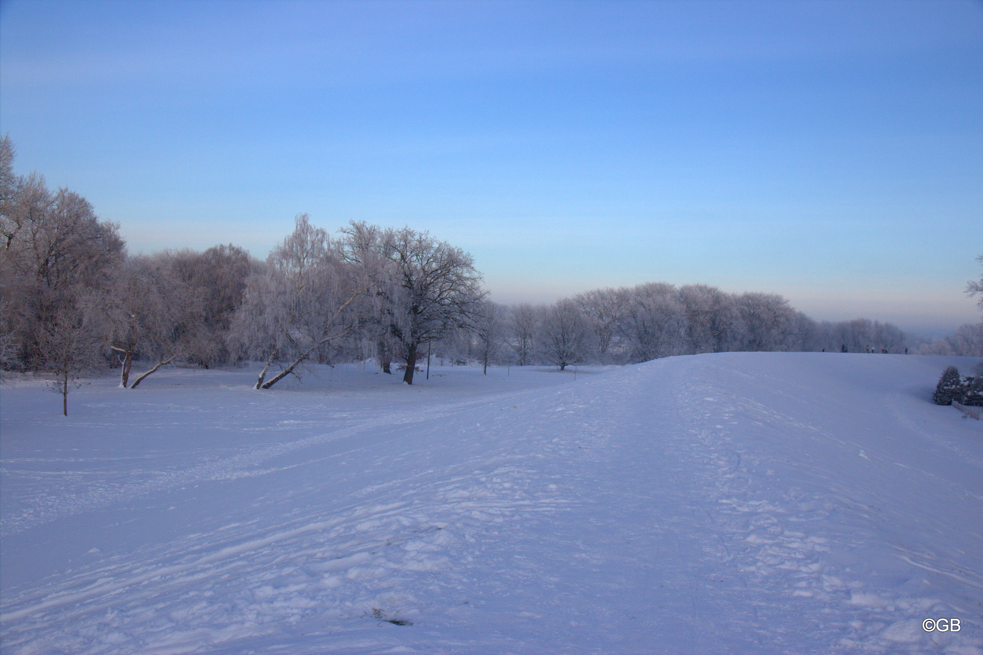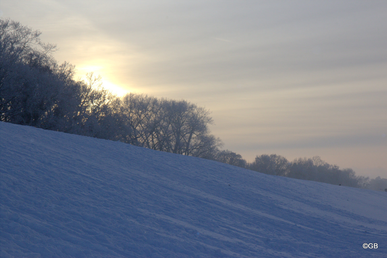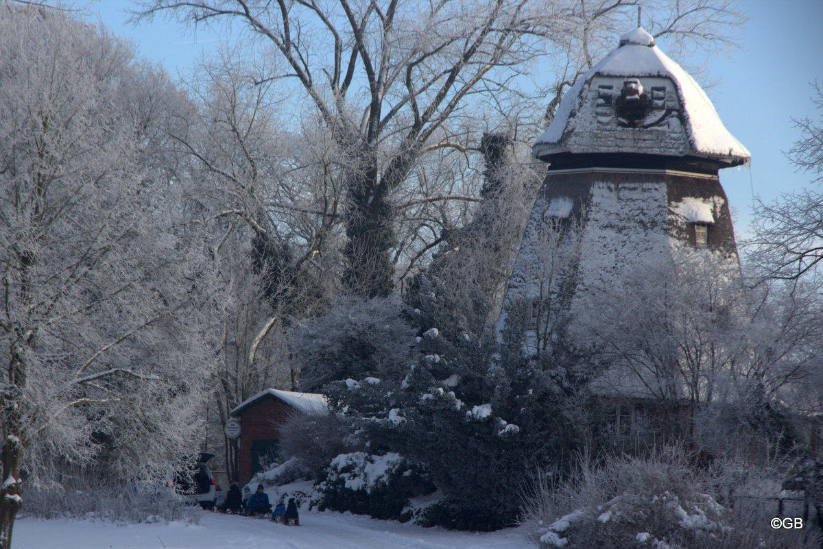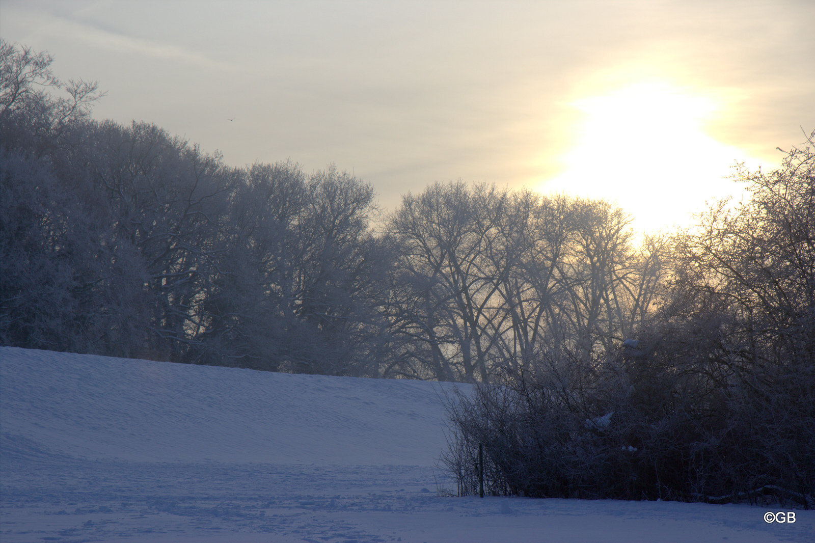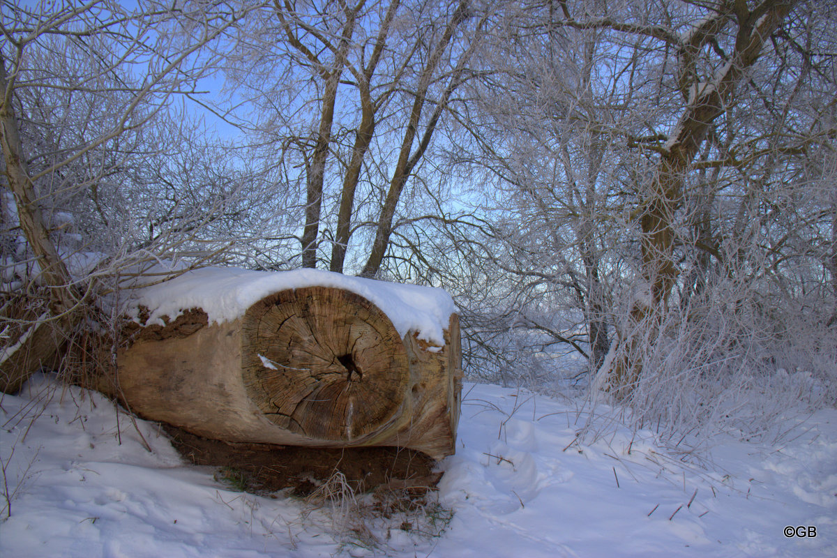 Höchst beeindruckend präsentierte sich die Landschaft in Schnee und Eis. Der Deich wurde von Spaziergängern zum Wandern genutzt, aber auch als ideale Rodelbahn. Die kalte Wintersonne tauchte alles in ein wunderschönes, teils sogar mystisches Licht, da auch Nebelschwaden übers Land zogen. – Wir stapften durch hohen Schnee auf der Rennbahn und unsere Vierbeiner wälzten sich genüsslich in der weißen Pracht. Am Elbstrand bewunderten wir die großen Eisschollen, aber betraten diesen Bereich vorsichtshalber nicht – sogar Sanny und Bonny blieben in unserer Nähe und wagten sich nicht an den Strand. Sie gingen meist sehr brav neben uns her, bis wir merkten, dass sie natürlich durch die vielen Eisklumpen an ihren Pfoten und Beinen beeinträchtigt waren. Nachdem wir sie davon befreit hatten, tollten Mutter und Tochter wieder vor lauter Freude miteinander im Schnee herum. – Wir beendeten unseren Rundgang bei Minus 6°C auf dem Deich und hatten dort noch nette Begegnungen mit Menschen, die unsere Begeisterung für das ungewöhnliche "Wintermärchen Stove" teilten.