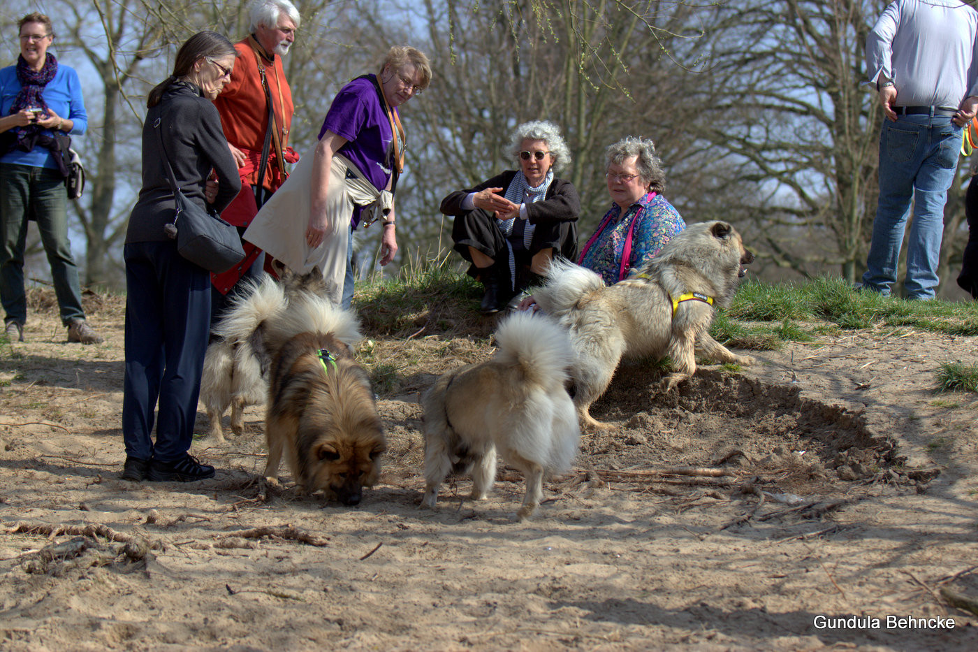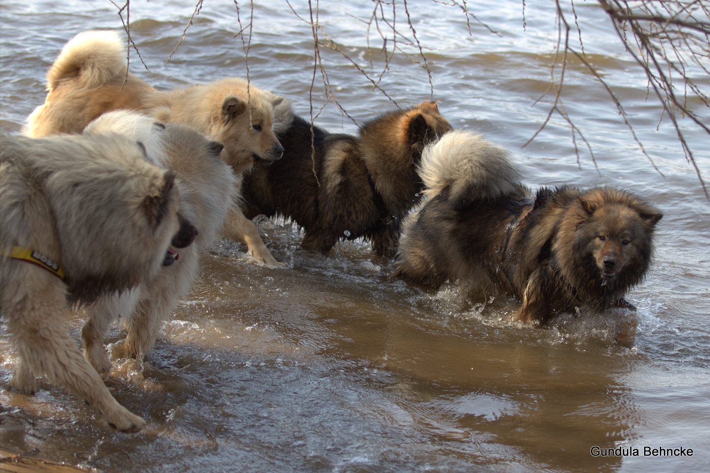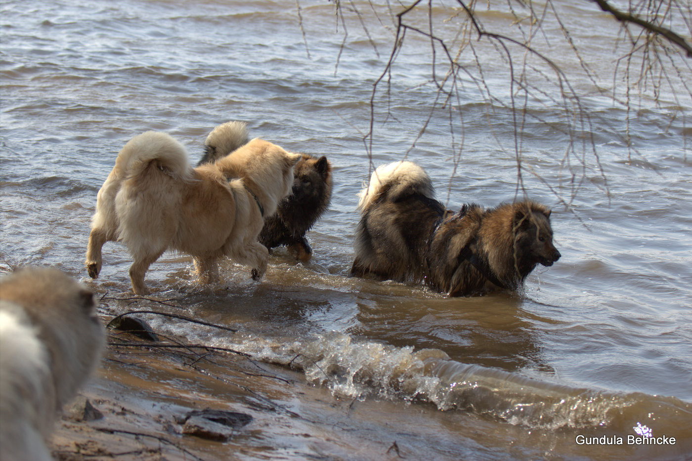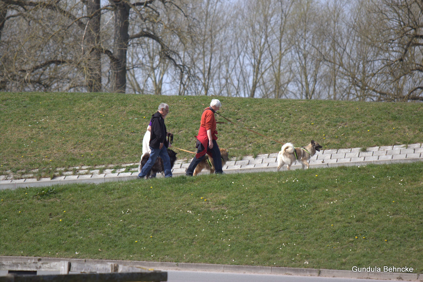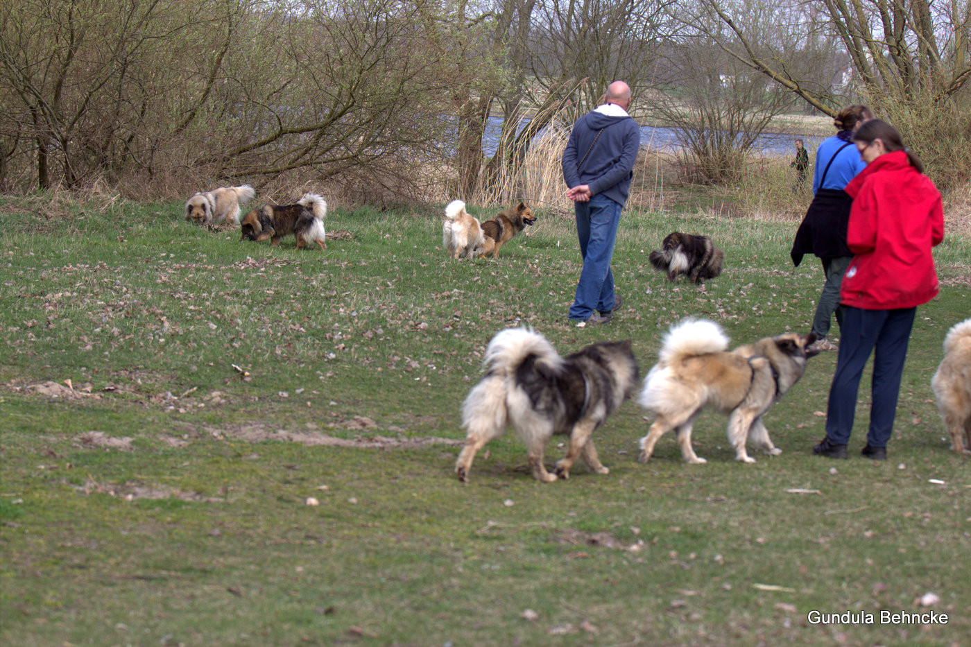Bei frühlingshafter Temperatur - knapp unter 20°C -, blauem Himmel und Sonnenschein trafen sich am Sonnabend, dem 11. April 2015, siebenundzwanzig Eurasier und die sie begleitenden Menschen auf dem Parkplatz an der Stover Rennbahn. Die Hunde begrüßten sich voller Wiedersehensfreude und konnten es kaum erwarten über den Deich geführt zu werden, um danach abgeleint auf den saftig grünen Elbwiesen toben zu dürfen. Es war gerade Flut, und somit erreichten die Wasserratten unter den Vierbeinern nach wenigen Sprüngen über den Strand das geliebte kühle Nass. Wir Zweibeiner freuten uns, dem munteren Spiel der Hunde im Wasser zusehen zu können. Da schon die ersten Frühlingsblumen blühten, gab es wieder einmal zauberhafte Durchblicke über den Ufersaum zum Elbstrom. Erst am Ende des Rundwegs zogen erste dunkle Wolken auf, sodass das anschließende Kaffeetrinken im Hotel "Zur Rennbahn" zwar zunächst noch im Cafe´-Garten begann, dann aber aufgrund plötzlich einsetzenden Regens doch noch nach drinnen verlegt werden musste. Doch dieses konnte der guten Stimmung bei Hund und Mensch keinen Abbruch tun. Die erste Vorsitzende der ZG, Dr. Michaela Witte, hatte für die Vierbeiner kleine Gläser mit selbst gebackenen Hundekeksen in verschiedenen Sorten mitgebracht und auf den Tischen verteilt, so dass auch unsere Eurasier eine kleine Stärkung bekommen konnten - eine sehr nette Idee - danke!