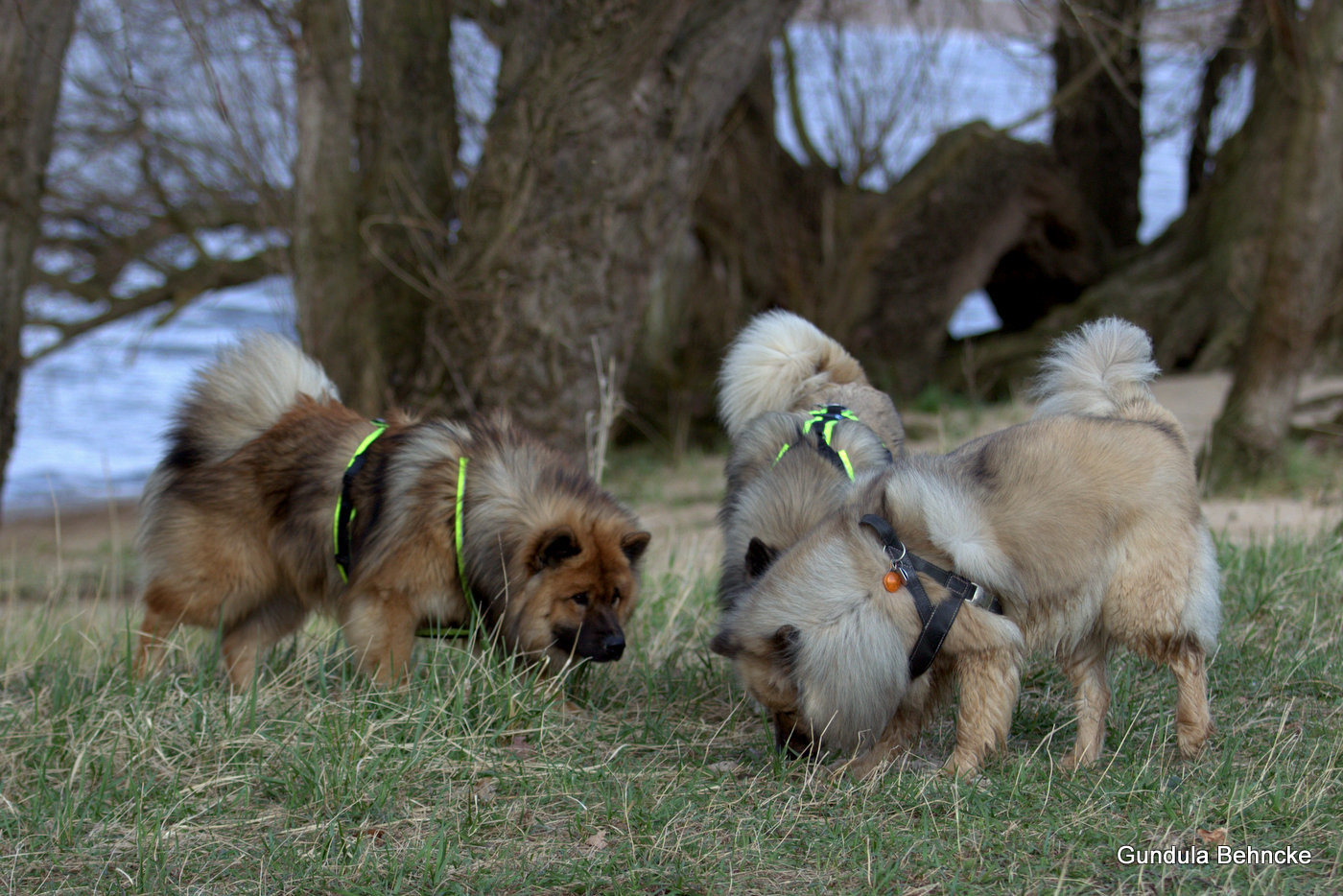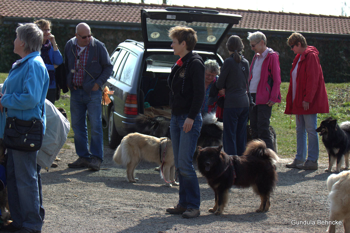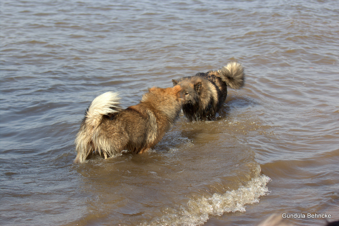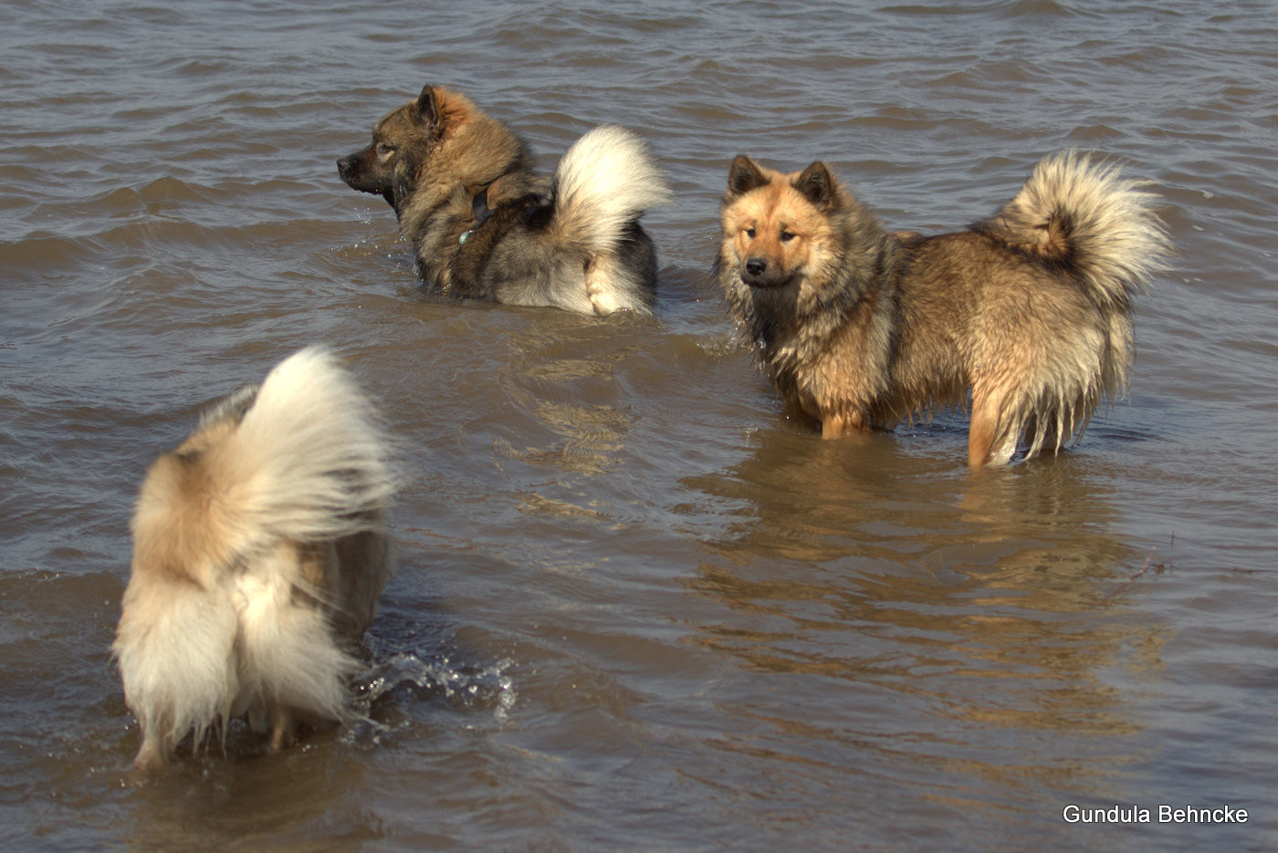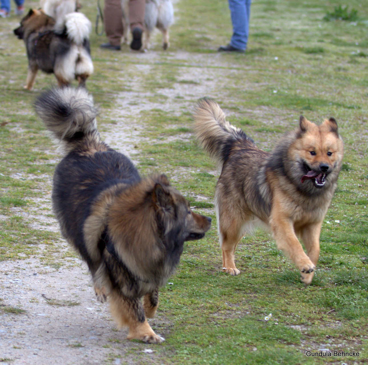 Bei frühlingshafter Temperatur - knapp unter 20°C -, blauem Himmel und Sonnenschein trafen sich am Sonnabend, dem 11. April 2015, siebenundzwanzig Eurasier und die sie begleitenden Menschen auf dem Parkplatz an der Stover Rennbahn. Die Hunde begrüßten sich voller Wiedersehensfreude und konnten es kaum erwarten über den Deich geführt zu werden, um danach abgeleint auf den saftig grünen Elbwiesen toben zu dürfen. Es war gerade Flut, und somit erreichten die Wasserratten unter den Vierbeinern nach wenigen Sprüngen über den Strand das geliebte kühle Nass. Wir Zweibeiner freuten uns, dem munteren Spiel der Hunde im Wasser zusehen zu können. Da schon die ersten Frühlingsblumen blühten, gab es wieder einmal zauberhafte Durchblicke über den Ufersaum zum Elbstrom. Erst am Ende des Rundwegs zogen erste dunkle Wolken auf, sodass das anschließende Kaffeetrinken im Hotel "Zur Rennbahn" zwar zunächst noch im Cafe´-Garten begann, dann aber aufgrund plötzlich einsetzenden Regens doch noch nach drinnen verlegt werden musste. Doch dieses konnte der guten Stimmung bei Hund und Mensch keinen Abbruch tun. Die erste Vorsitzende der ZG, Dr. Michaela Witte, hatte für die Vierbeiner kleine Gläser mit selbst gebackenen Hundekeksen in verschiedenen Sorten mitgebracht und auf den Tischen verteilt, so dass auch unsere Eurasier eine kleine Stärkung bekommen konnten - eine sehr nette Idee - danke!