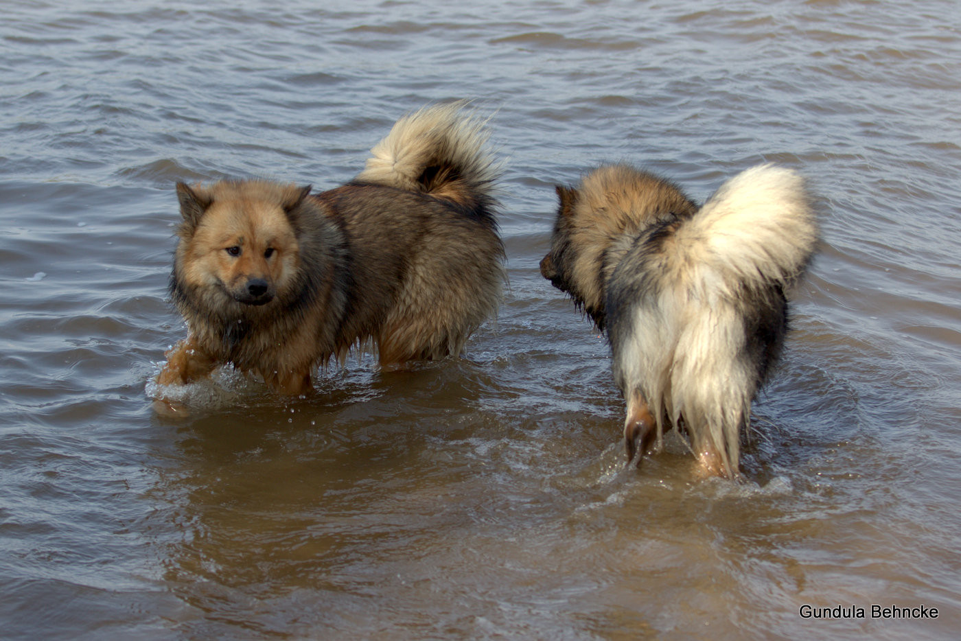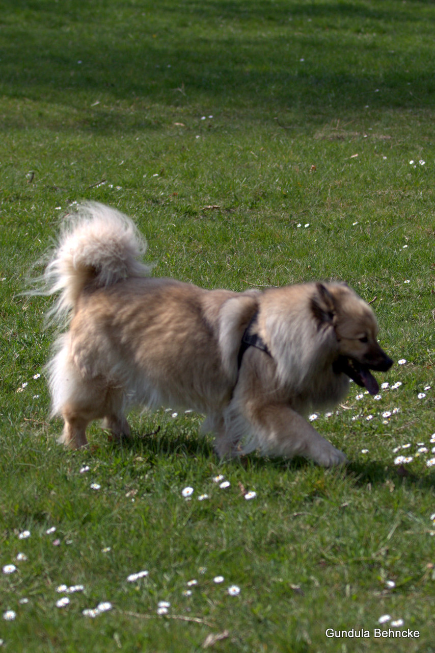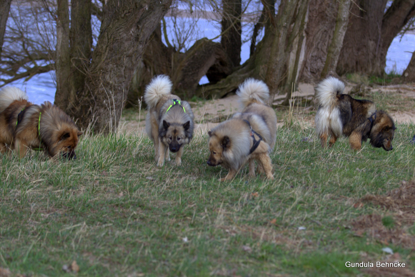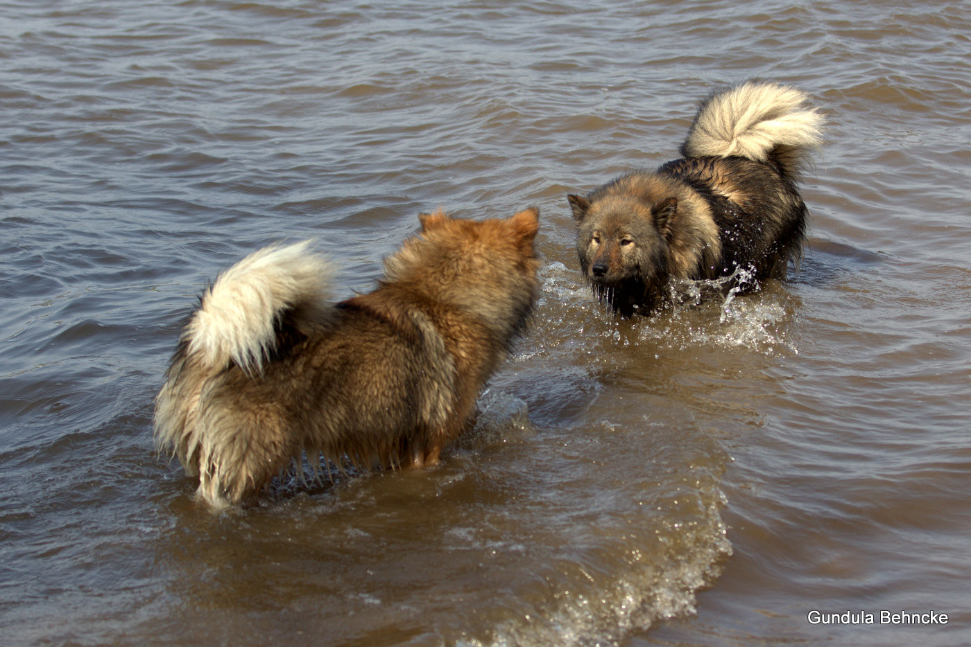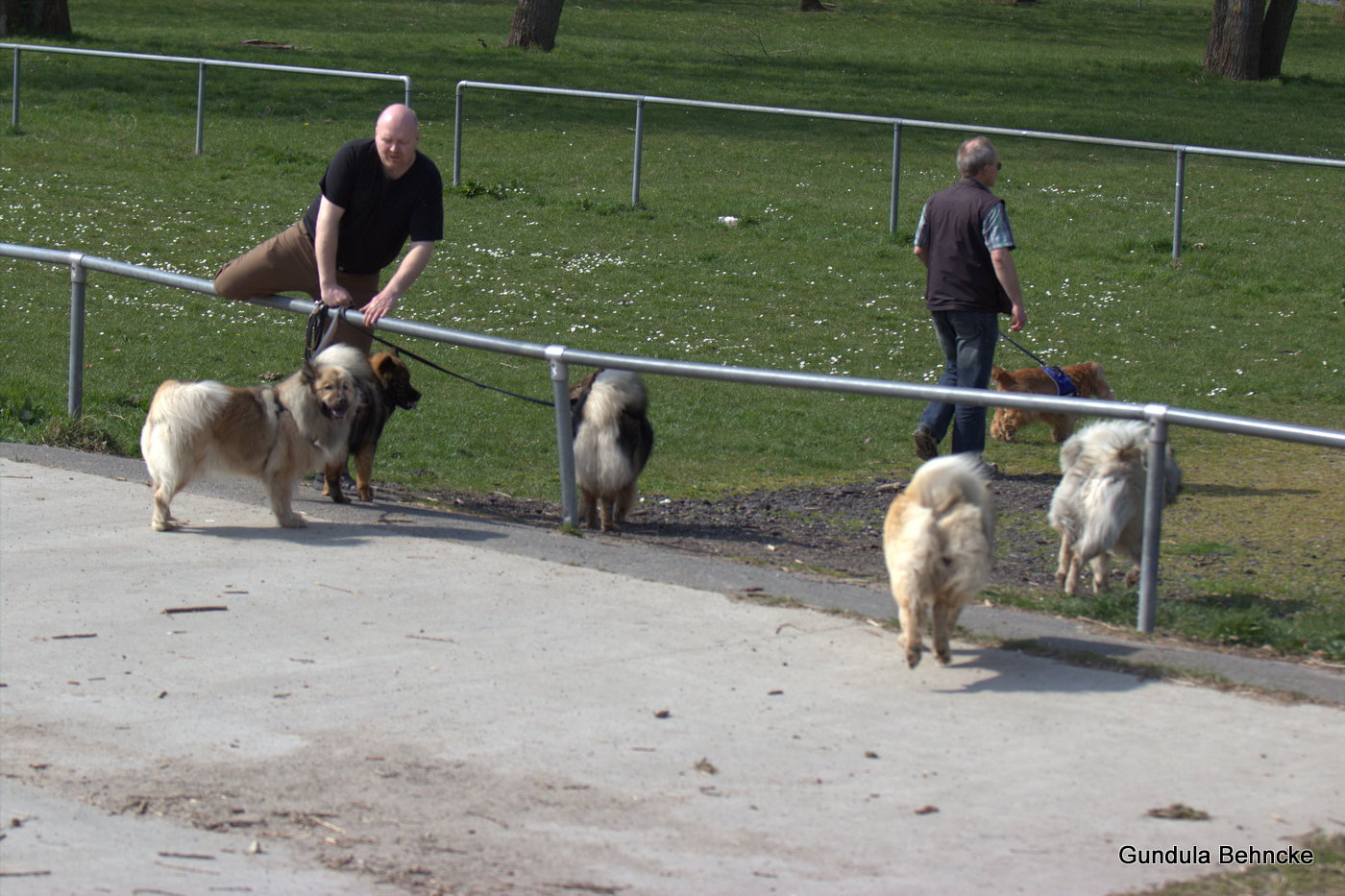 Bei frühlingshafter Temperatur - knapp unter 20°C -, blauem Himmel und Sonnenschein trafen sich am Sonnabend, dem 11. April 2015, siebenundzwanzig Eurasier und die sie begleitenden Menschen auf dem Parkplatz an der Stover Rennbahn. Die Hunde begrüßten sich voller Wiedersehensfreude und konnten es kaum erwarten über den Deich geführt zu werden, um danach abgeleint auf den saftig grünen Elbwiesen toben zu dürfen. Es war gerade Flut, und somit erreichten die Wasserratten unter den Vierbeinern nach wenigen Sprüngen über den Strand das geliebte kühle Nass. Wir Zweibeiner freuten uns, dem munteren Spiel der Hunde im Wasser zusehen zu können. Da schon die ersten Frühlingsblumen blühten, gab es wieder einmal zauberhafte Durchblicke über den Ufersaum zum Elbstrom. Erst am Ende des Rundwegs zogen erste dunkle Wolken auf, sodass das anschließende Kaffeetrinken im Hotel "Zur Rennbahn" zwar zunächst noch im Cafe´-Garten begann, dann aber aufgrund plötzlich einsetzenden Regens doch noch nach drinnen verlegt werden musste. Doch dieses konnte der guten Stimmung bei Hund und Mensch keinen Abbruch tun. Die erste Vorsitzende der ZG, Dr. Michaela Witte, hatte für die Vierbeiner kleine Gläser mit selbst gebackenen Hundekeksen in verschiedenen Sorten mitgebracht und auf den Tischen verteilt, so dass auch unsere Eurasier eine kleine Stärkung bekommen konnten - eine sehr nette Idee - danke!