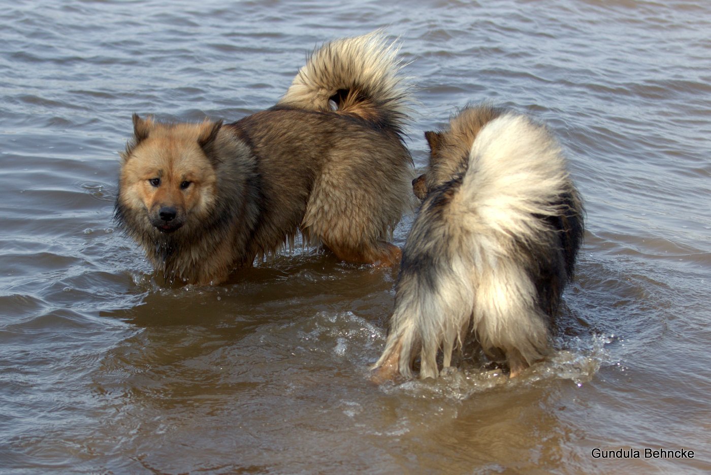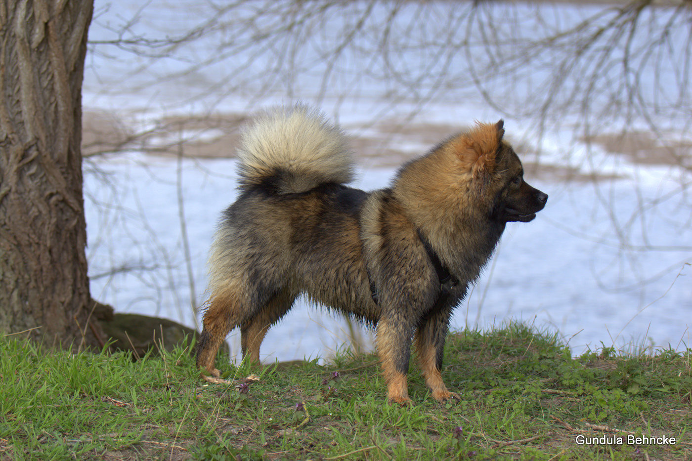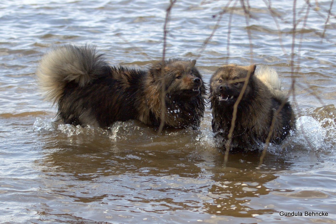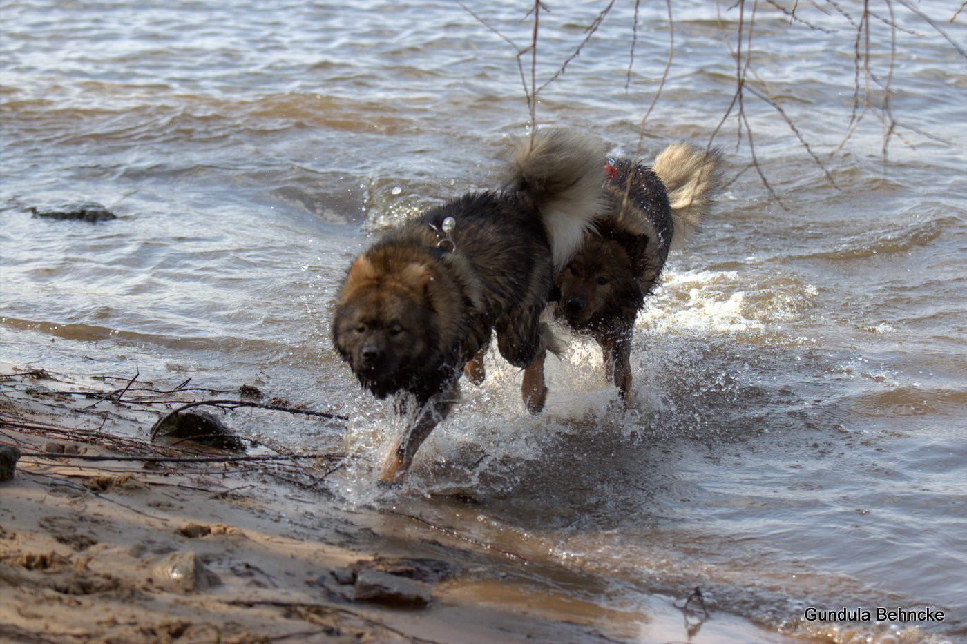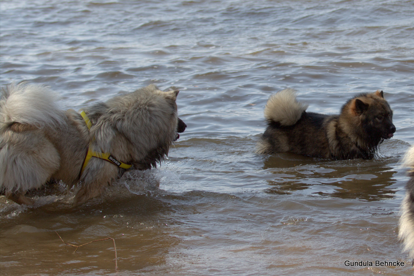Bei frühlingshafter Temperatur - knapp unter 20°C -, blauem Himmel und Sonnenschein trafen sich am Sonnabend, dem 11. April 2015, siebenundzwanzig Eurasier und die sie begleitenden Menschen auf dem Parkplatz an der Stover Rennbahn. Die Hunde begrüßten sich voller Wiedersehensfreude und konnten es kaum erwarten über den Deich geführt zu werden, um danach abgeleint auf den saftig grünen Elbwiesen toben zu dürfen. Es war gerade Flut, und somit erreichten die Wasserratten unter den Vierbeinern nach wenigen Sprüngen über den Strand das geliebte kühle Nass. Wir Zweibeiner freuten uns, dem munteren Spiel der Hunde im Wasser zusehen zu können. Da schon die ersten Frühlingsblumen blühten, gab es wieder einmal zauberhafte Durchblicke über den Ufersaum zum Elbstrom. Erst am Ende des Rundwegs zogen erste dunkle Wolken auf, sodass das anschließende Kaffeetrinken im Hotel "Zur Rennbahn" zwar zunächst noch im Cafe´-Garten begann, dann aber aufgrund plötzlich einsetzenden Regens doch noch nach drinnen verlegt werden musste. Doch dieses konnte der guten Stimmung bei Hund und Mensch keinen Abbruch tun. Die erste Vorsitzende der ZG, Dr. Michaela Witte, hatte für die Vierbeiner kleine Gläser mit selbst gebackenen Hundekeksen in verschiedenen Sorten mitgebracht und auf den Tischen verteilt, so dass auch unsere Eurasier eine kleine Stärkung bekommen konnten - eine sehr nette Idee - danke!