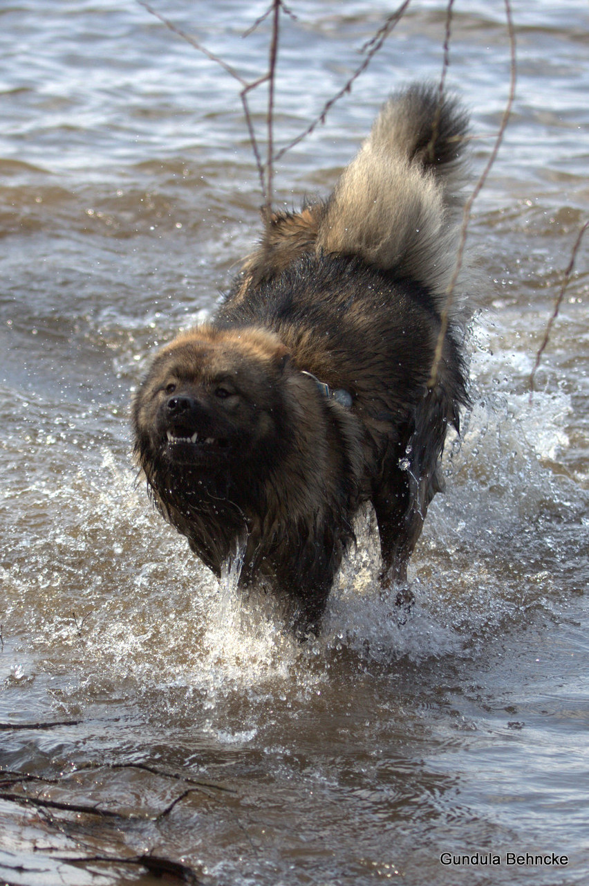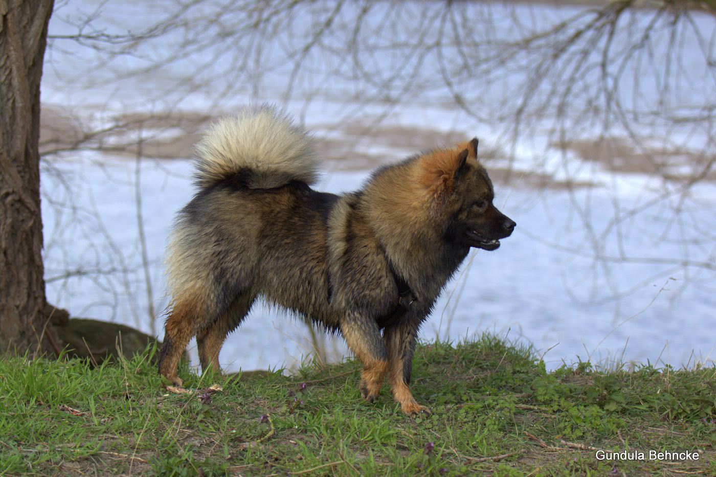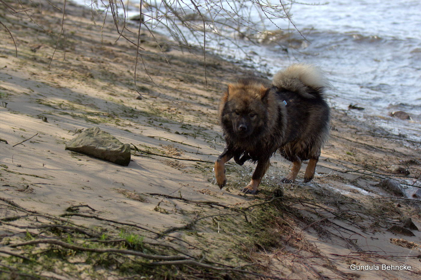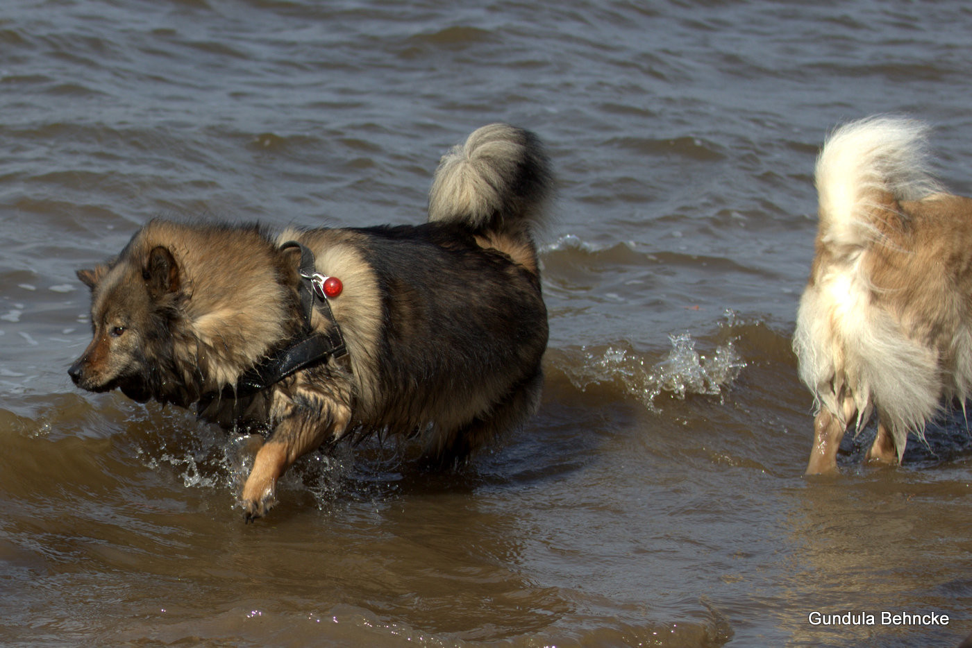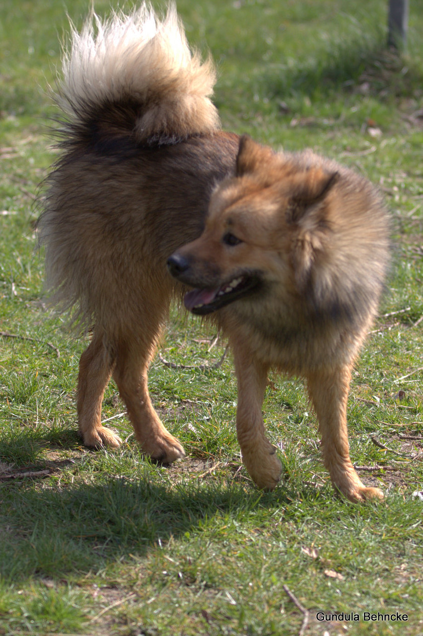 Bei frühlingshafter Temperatur - knapp unter 20°C -, blauem Himmel und Sonnenschein trafen sich am Sonnabend, dem 11. April 2015, siebenundzwanzig Eurasier und die sie begleitenden Menschen auf dem Parkplatz an der Stover Rennbahn. Die Hunde begrüßten sich voller Wiedersehensfreude und konnten es kaum erwarten über den Deich geführt zu werden, um danach abgeleint auf den saftig grünen Elbwiesen toben zu dürfen. Es war gerade Flut, und somit erreichten die Wasserratten unter den Vierbeinern nach wenigen Sprüngen über den Strand das geliebte kühle Nass. Wir Zweibeiner freuten uns, dem munteren Spiel der Hunde im Wasser zusehen zu können. Da schon die ersten Frühlingsblumen blühten, gab es wieder einmal zauberhafte Durchblicke über den Ufersaum zum Elbstrom. Erst am Ende des Rundwegs zogen erste dunkle Wolken auf, sodass das anschließende Kaffeetrinken im Hotel "Zur Rennbahn" zwar zunächst noch im Cafe´-Garten begann, dann aber aufgrund plötzlich einsetzenden Regens doch noch nach drinnen verlegt werden musste. Doch dieses konnte der guten Stimmung bei Hund und Mensch keinen Abbruch tun. Die erste Vorsitzende der ZG, Dr. Michaela Witte, hatte für die Vierbeiner kleine Gläser mit selbst gebackenen Hundekeksen in verschiedenen Sorten mitgebracht und auf den Tischen verteilt, so dass auch unsere Eurasier eine kleine Stärkung bekommen konnten - eine sehr nette Idee - danke!