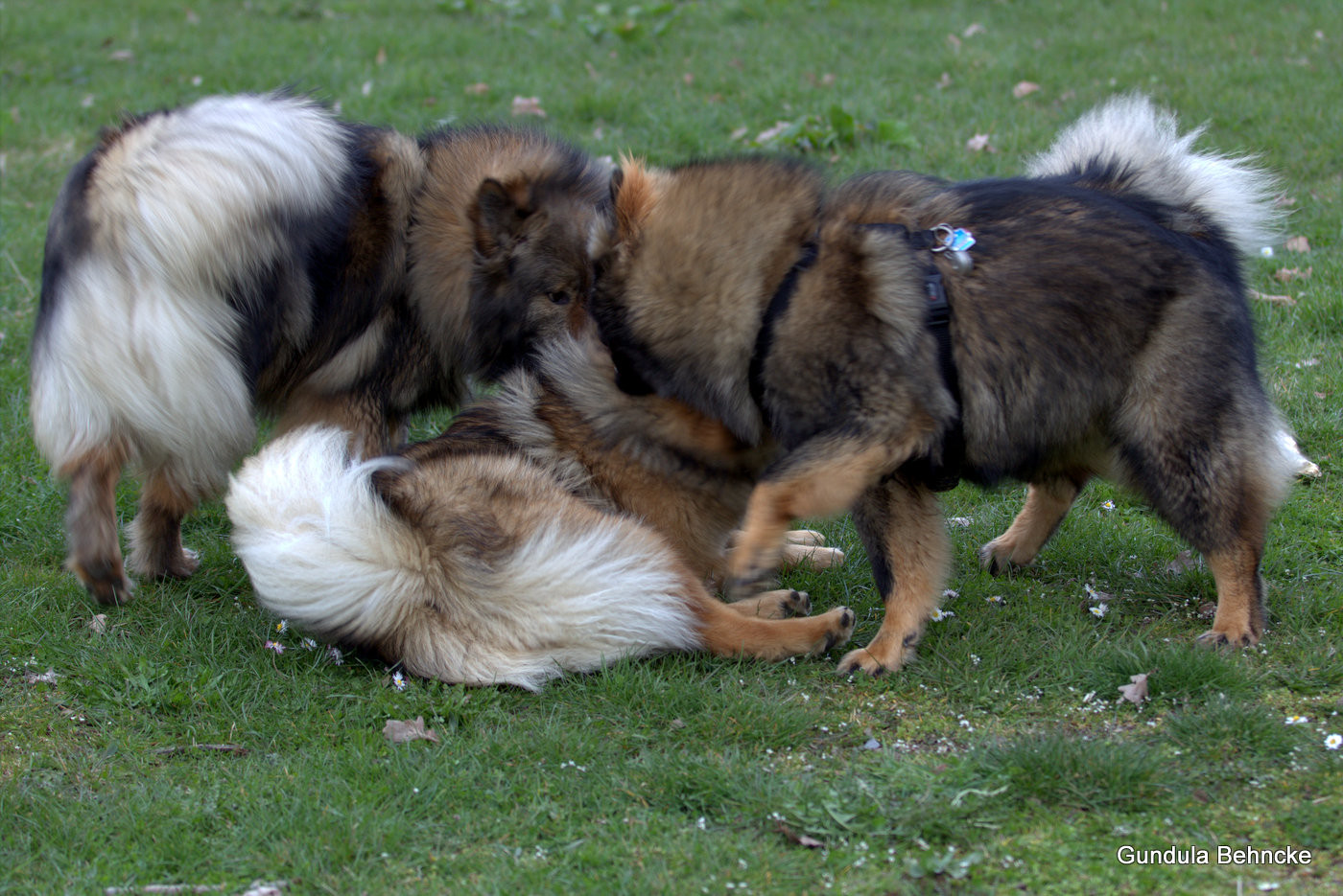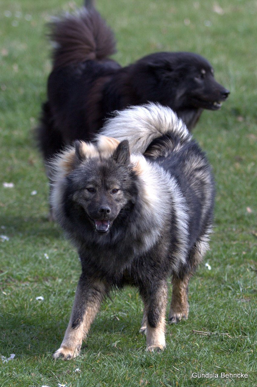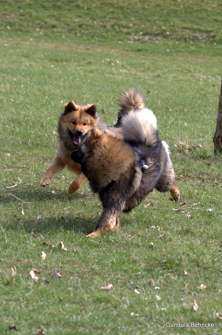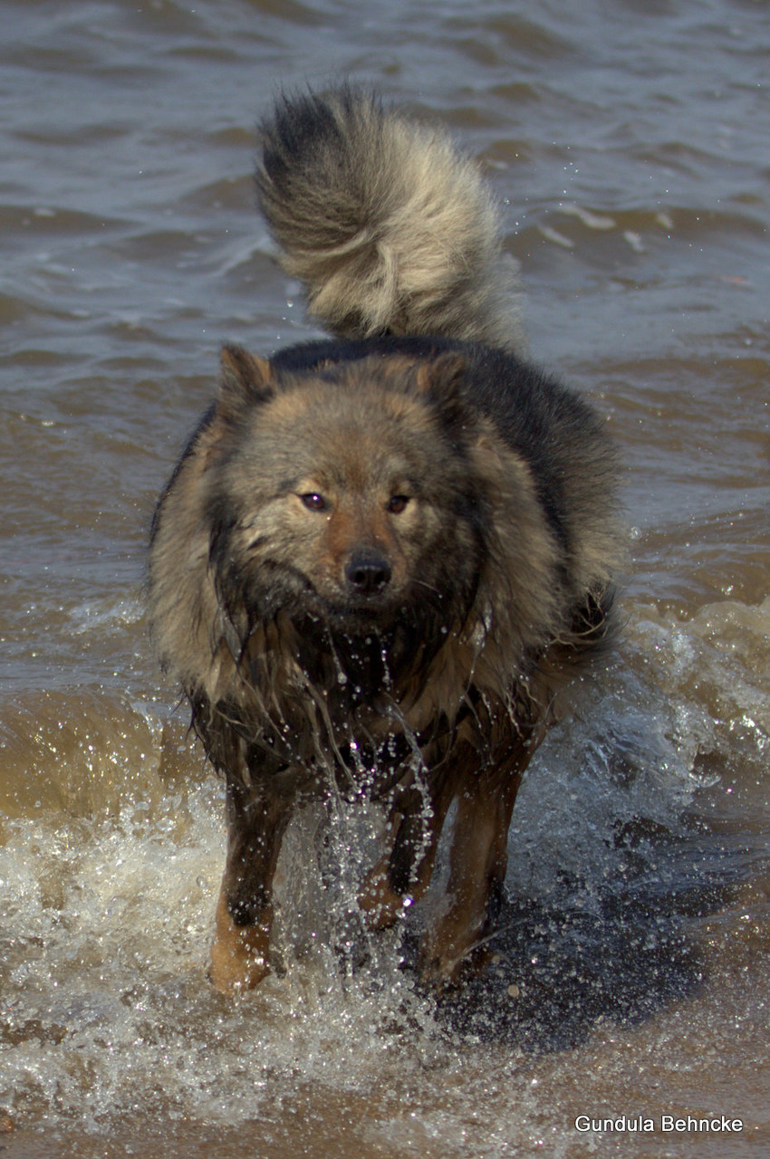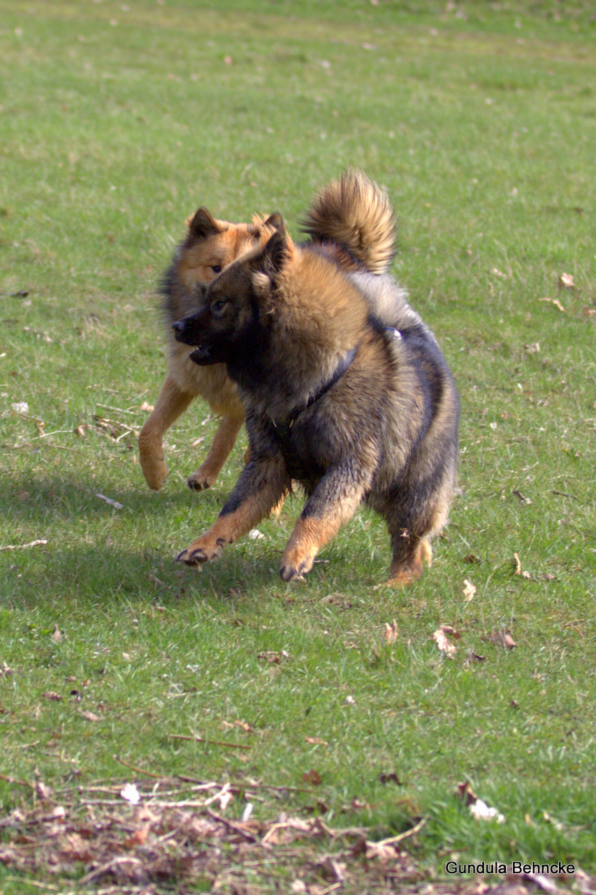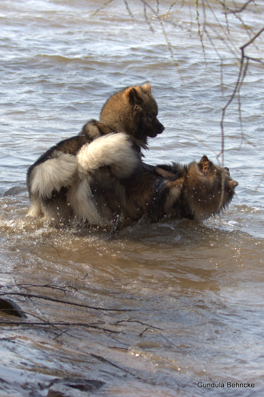 Bei frühlingshafter Temperatur - knapp unter 20°C -, blauem Himmel und Sonnenschein trafen sich am Sonnabend, dem 11. April 2015, siebenundzwanzig Eurasier und die sie begleitenden Menschen auf dem Parkplatz an der Stover Rennbahn. Die Hunde begrüßten sich voller Wiedersehensfreude und konnten es kaum erwarten über den Deich geführt zu werden, um danach abgeleint auf den saftig grünen Elbwiesen toben zu dürfen. Es war gerade Flut, und somit erreichten die Wasserratten unter den Vierbeinern nach wenigen Sprüngen über den Strand das geliebte kühle Nass. Wir Zweibeiner freuten uns, dem munteren Spiel der Hunde im Wasser zusehen zu können. Da schon die ersten Frühlingsblumen blühten, gab es wieder einmal zauberhafte Durchblicke über den Ufersaum zum Elbstrom. Erst am Ende des Rundwegs zogen erste dunkle Wolken auf, sodass das anschließende Kaffeetrinken im Hotel "Zur Rennbahn" zwar zunächst noch im Cafe´-Garten begann, dann aber aufgrund plötzlich einsetzenden Regens doch noch nach drinnen verlegt werden musste. Doch dieses konnte der guten Stimmung bei Hund und Mensch keinen Abbruch tun. Die erste Vorsitzende der ZG, Dr. Michaela Witte, hatte für die Vierbeiner kleine Gläser mit selbst gebackenen Hundekeksen in verschiedenen Sorten mitgebracht und auf den Tischen verteilt, so dass auch unsere Eurasier eine kleine Stärkung bekommen konnten - eine sehr nette Idee - danke!